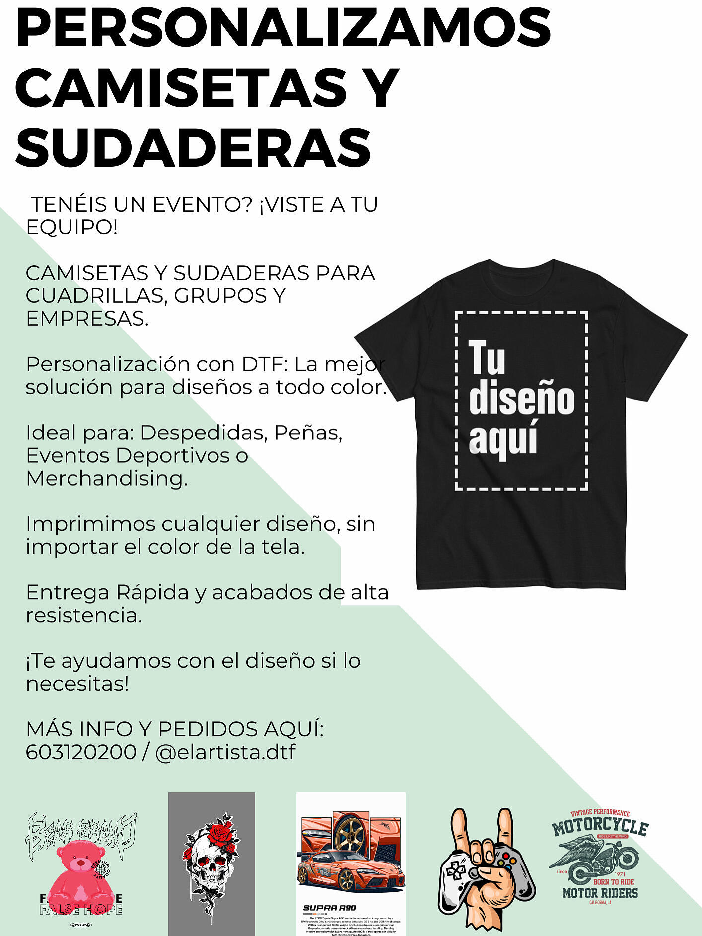 Ofrecemos camisetas y prendas personalizadas con técnica DTF, ideales para regalos, empresas, eventos o uso personal, con acabados de alta calidad y gran durabilidad.Trabajamos con productos de confianza, asesoramiento personalizado y precios competitivos.